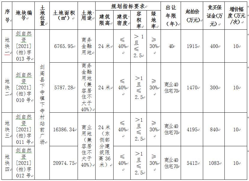 四、本次拍賣出讓的詳細(xì)資料和具體要求,詳見拍賣出讓文件。申請人可于2021年11月23日至2021年12月8日到劍閣縣自然資源儲備交易中心獲取拍賣出讓文件。