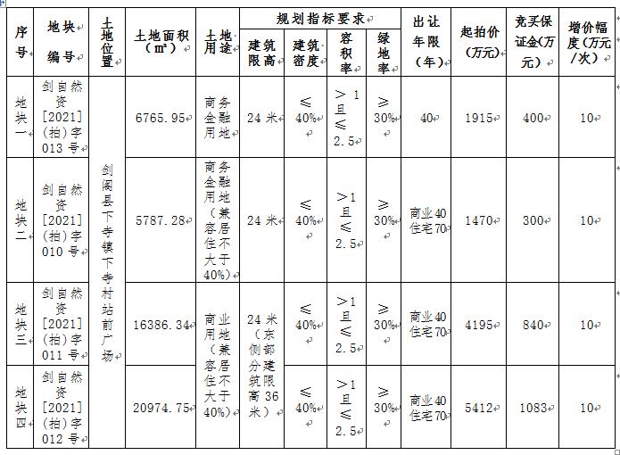 四、本次拍賣出讓的詳細(xì)資料和具體要求,詳見拍賣出讓文件。申請(qǐng)人可于2022年4月19日至2022年5月5日到劍閣縣自然資源儲(chǔ)備交易中心獲取拍賣出讓文件。