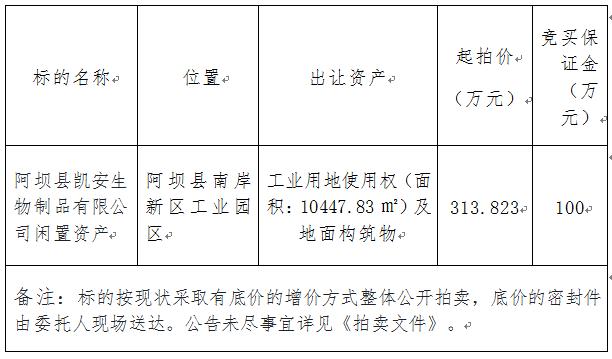 經阿壩縣人民政府批準,受阿壩縣凱安生物制品有限公司委托,定于2023 年5月11日10:00時在阿壩藏族羌族自治州公共資源交易中心(汶川縣威州鎮東街246號)四樓產權交易大廳依法按現狀采取有底價的增價方式對阿壩縣凱安生物制品有限公司閑置資產進行公開拍賣,現將有關事項公告如下: