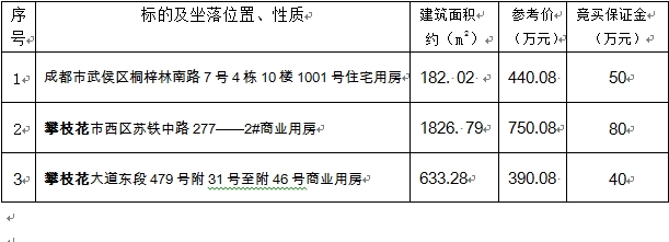 受委托,我公司將于2023年10月31日15:00在我公司會議室(成都市錦江區畢昇路468號創世紀廣場31樓)對以下房產按標的現狀進行公開拍賣,現將拍賣相關事宜公告如下:
